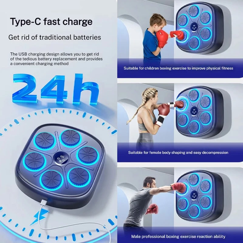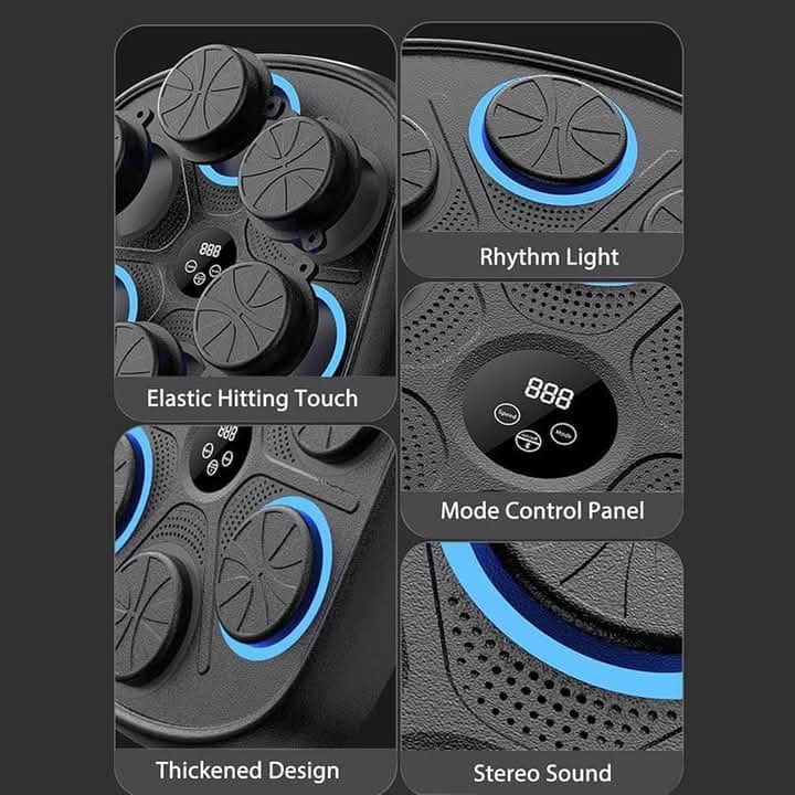 - Máquina de Boxeo Musical: Con 5 parlantes incorporados, esta máquina se conecta a tu teléfono celular para reproducir tu música favorita mientras entrenas. Esta combinación de ejercicio y música te ayudará a mantenerte motivado siempre comprometido durante todo el entrenamiento.