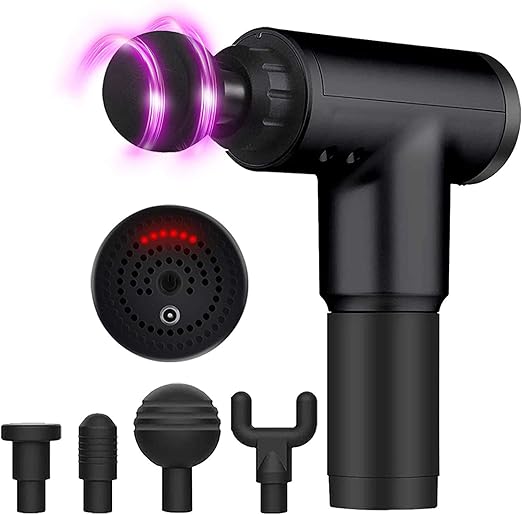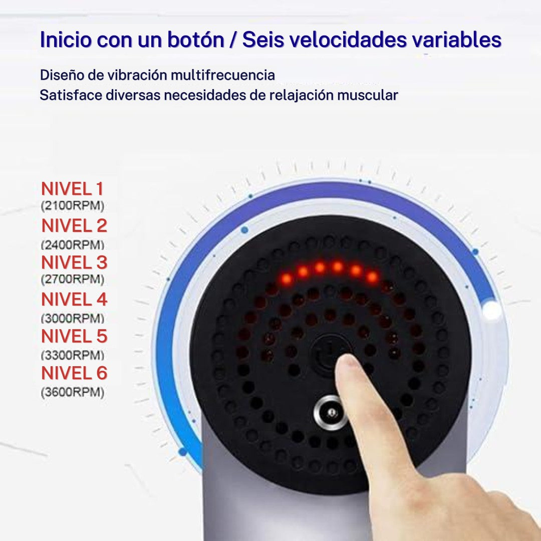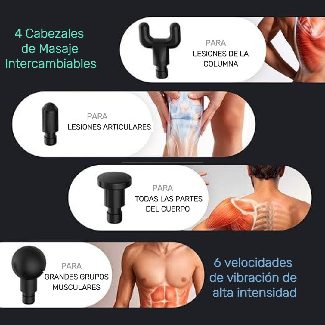 - 4 cabezales de masaje y 6 velocidades: 4 tipos de cabezales de masaje. De acuerdo con la ubicación del masaje, podrá elegir el tipo de cabezal para brindar una experiencia de masaje más completa. Este masajeador tiene 6 niveles de velocidad, que te permiten obtener la cantidad correcta y adecuada de presión para aliviar tu dolor muscular.